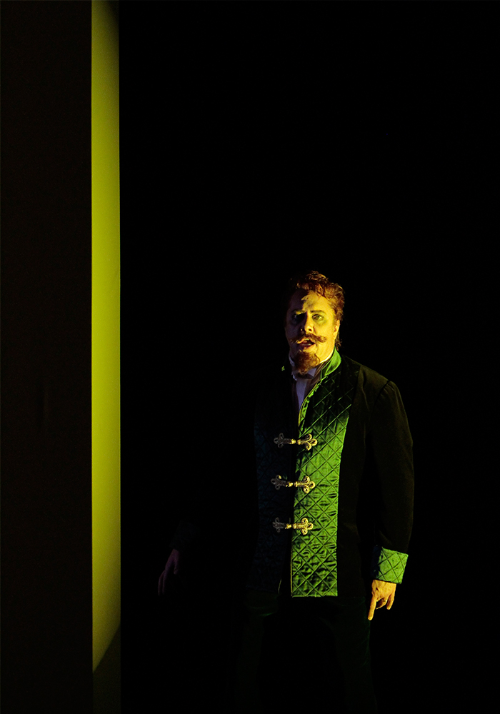 The production, a brand-new one created for LA by director Elkhanah Pulitzer, was one of those stagings that teeter just on the cusp between traditional and Regie, but lean more toward tradition. The set design was minimalistic, with stark walls and angular scenery that just barely suggested each locale, while the costumes were equally simple, stylized 19th century garb.  So far so boring, but what made the production memorable were the moody lighting and the cinematic CGI projections that enhanced every scene. The lighting was dark, but punctuated by ominous neon colors. We saw plenty of blood red at various points, as well as a backdrop of glaring yellow during the Lucia/Enrico confrontation in Act I (with Enrico’s towering shadow emphasizing his power over his sister) and one of sickly green for the Mad Scene. Meanwhile, the projections created the trees of the forest and the archways of Enrico’s castle, gave us a lovely light show perfectly timed to the music to carry us from the men’s world to Lucia’s between the first two scenes, and then showed us Lucia’s vision of her ancestress’s Ophelia-like ghost, complete with rippling water and flowing blood. Predictably, the Mad Scene saw this vision reappear. I’ll admit that the imagery was a little distracting (“Very distracting!” according to the man behind me), but still, it was beautiful and fittingly eerie.